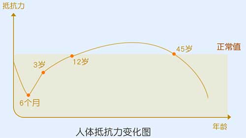 可以看出,嬰幼兒的抵抗力隨著時(shí)間的推移劃出了一條彎曲的弧線(xiàn),自出生到6月這段時(shí)間,抵抗力不斷降低,6個(gè)月后才開(kāi)始逐漸攀升。