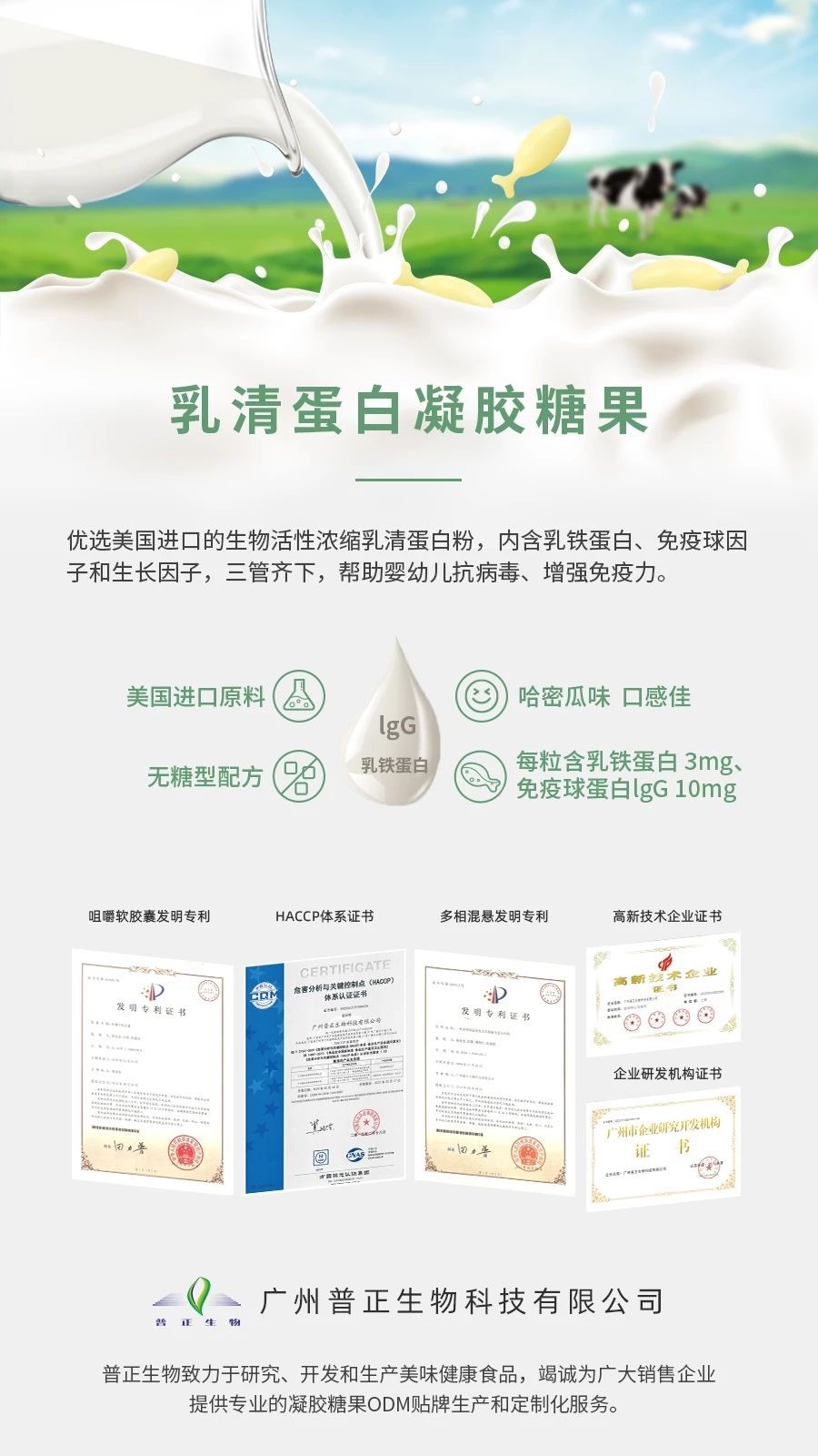 我們研發(fā)的乳清蛋白凝膠糖果,可愛的小魚形狀,蜜瓜牛奶口味,一粒含有3毫克的乳鐵蛋白和約10毫克的免疫球蛋白IgG,運(yùn)用普正自有的iChew技術(shù)進(jìn)行深加工,令其咀嚼起來口感更細(xì)膩軟糯,內(nèi)容物粒徑達(dá)到數(shù)十微米級別更利吸收,天然貼合寶寶的營養(yǎng)需求,讓寶寶喜歡吃,放心吃,健康吃!